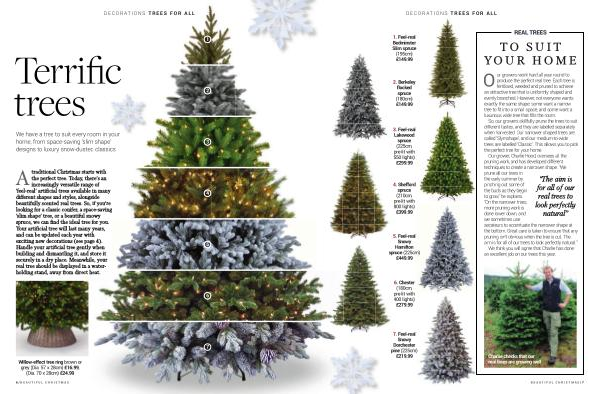 the perfect tree . Today , there ’ s an increasingly versatile range of ‘ feel-real ’ artificial trees available in many different shapes and styles , alongside beautifully scented real trees . So , if you ’ re looking for a classic conifer , a space-saving ‘ slim shape ’ tree , or a beautiful snowy spruce , we can find the ideal tree for you . Your artificial tree will last many years , and can be updated each year with exciting new decorations ( see page 4 ). Handle your artificial tree gently when building and dismantling it , and store it securely in a dry place . Meanwhile , your real tree should be displayed in a waterholding stand , away from direct heat .