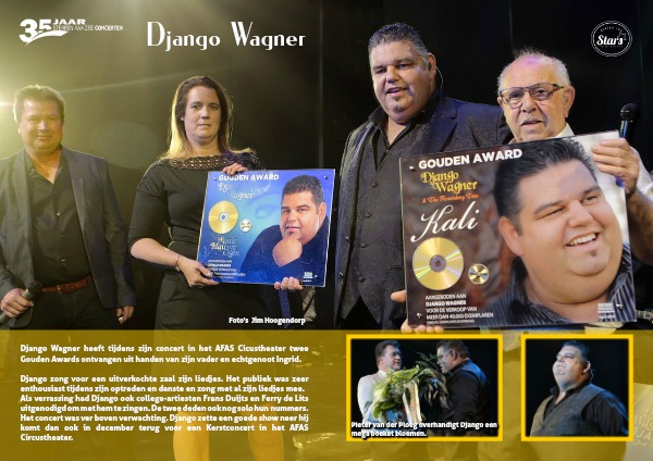 Django Wagner heeft tijdens zijn concert in het AFAS Cicustheater twee Gouden Awards ontvangen uit handen van zijn vader en echtgenoot Ingrid.