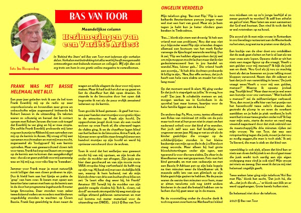‘Bas...', klonk zijn stem wat droevig ‘ik heb een vriend met een probleem.' Nou dat was niet zo,n bijzonder want Flip zijn vrienden dragen allemaal een kostuum van het merk Kevlar vanwege de fijne kogel werende werking. Dus ik zei; ‘Flip we hadden afgesproken dat jij wel om mijn moppen mocht lachen maar dat ik niet gedesinteresseerd ben in jou handel en wandel.‘Nee, luister gek...' Die vriend heeft een zoontje...' Ik heb drie dochters probeerde ik lollig te zijn.. ‘Nee, Bas effe serieus, dat joch heeft een hele nare ziekte en maakt het niet lang meer.'