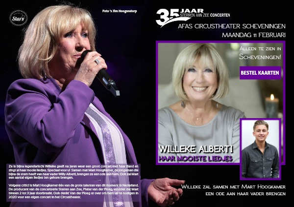 Ze is bijna legendarisch! Willeke geeft na jaren weer een groot concert met haar Band en zingt al haar mooie liedjes. Speciaal voor u! Samen met Mart Hoogkamer, de jongeman die bijna de stem heeft van haar vader Willy Alberti, brengen ze een ode aan hem. Ook zal Mart een aantal eigen liedjes ten gehore brengen.