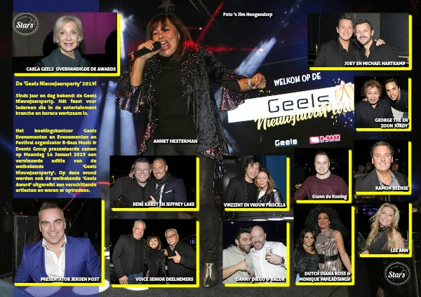 Het boekingskantoor Geels Evenementen en Evenementen en Festival organisator B-Bass Music & Events Group presenteerde samen op Maandag 14 Januari 2019 een vernieuwde editie van de welbekende 'Geels Nieuwjaarsparty'. Op deze avond werden ook de welbekende 'Geels Award' uitgereikt aan verschillende artiesten en waren er optredens.