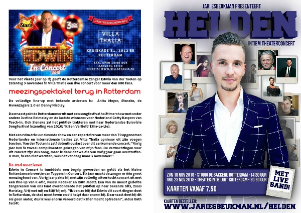 Voor het vierde jaar op rij geeft de Rotterdamse zanger Edwin van der Toolen op zaterdag 3 november in Villa Thalia een live concert voor meer dan 800 fans.