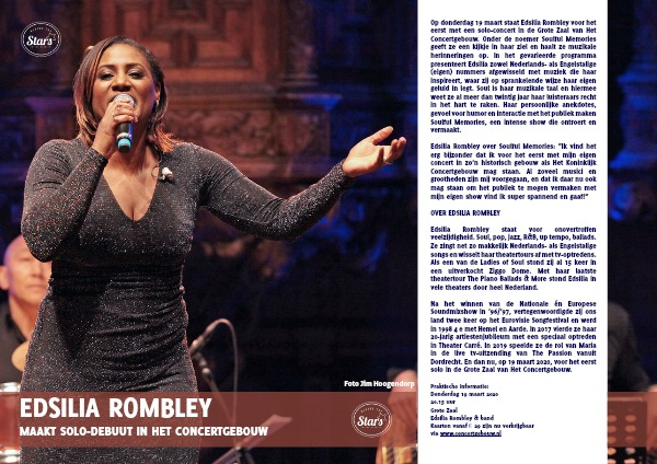 Op donderdag 19 maart staat Edsilia Rombley voor het eerst met een solo-concert in de Grote Zaal van Het Concertgebouw. Onder de noemer Soulful Memories geeft ze een kijkje in haar ziel en haalt ze muzikale herinneringen op. In het gevarieerde programma presenteert Edsilia zowel Nederlands- als Engelstalige (eigen) nummers afgewisseld met muziek die haar inspireert, waar zij op sprankelende wijze haar eigen geluid in legt. Soul is haar muzikale taal en hiermee weet ze al meer dan twintig jaar haar luisteraars recht in het hart te raken. Haar persoonlijke anekdotes, gevoel voor humor en interactie met het publiek maken Soulful Memories, een intense show die ontroert en vermaakt.