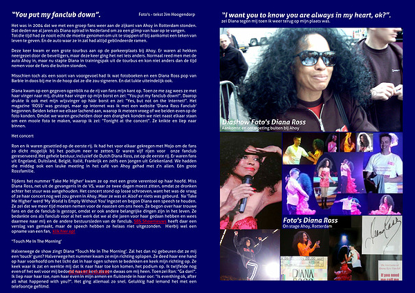 Diana kwam op een gegeven ogenblik na de rij van fans mijn kant op. Toen ze me zag wees ze met haar vinger naar mij, drukte haar vinger op mijn borst en zei: “You put my fanclub down!”. Daarop drukte ik ook met mijn wijsvinger op háár borst en zei: “Yes, but not on the internet!”. Het magazine 'ROSS' was gestopt, maar op internet was ik met een website 'Diana Ross Fanclub' begonnen. Beiden keken we elkaar lachend aan, waarop ik meteen vroeg of we beiden even op de foto konden. Omdat we waren gescheiden door een dranghek konden we niet naast elkaar staan om een mooie foto te maken, waarop ik zei: “Tonight at the concert”. Ze knikte en liep naar binnen.
