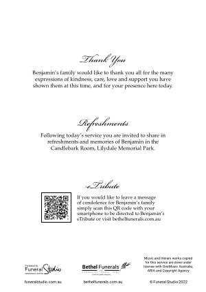If you would like to leave a message of condolence for Benjamin ’ s family simply scan this QR code with your smartphone to be directed to Benjamin ’ s eTribute or visit bethelfunerals . com . au