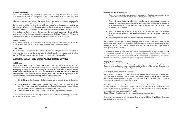 First Offense: Confiscation. Device returned to students at the end of the day. Second Offense: Confiscation. Device returned to student at the end of the day. However, the parents( s)/ guardian( s) will be notified that upon the next offense, the device will be returned to parents( s)/ guardian( s) only. Third Offense: Confiscation. Device returned to parent( s)/ guardian( s).