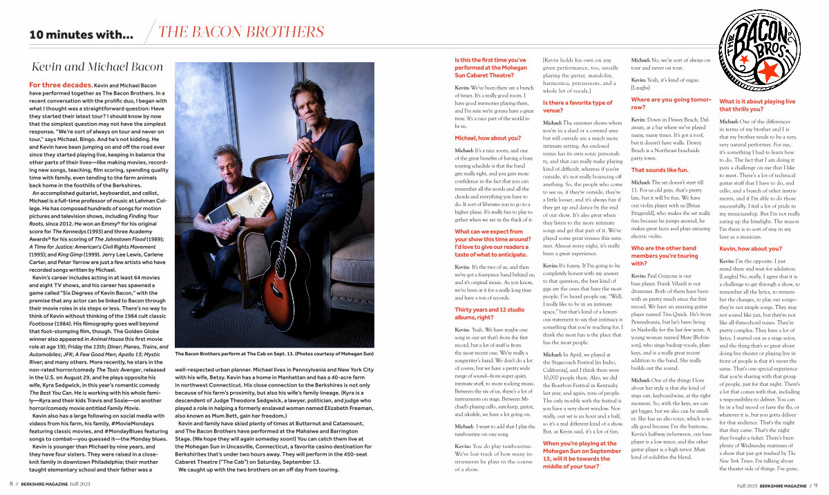 For three decades, Kevin and Michael Bacon have performed together as The Bacon Brothers. In a recent conversation with the prolific duo, I began with what I thought was a straightforward question: Have they started their latest tour? I should know by now that the simplest question may not have the simplest response.“ We’ re sort of always on tour and never on tour,” says Michael. Bingo. And he’ s not kidding. He and Kevin have been jumping on and off the road ever since they started playing live, keeping in balance the other parts of their lives— like making movies, recording new songs, teaching, film scoring, spending quality time with family, even tending to the farm animals back home in the foothills of the Berkshires.