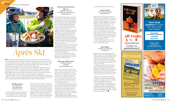 Whether you’ re celebrating a full day of first tracks or simply showing up for some fireside fun, the après ski scene in the Berkshires offers something for everyone. From local libations to lively tunes and everything in between, it’ s proof that winter fun doesn’ t stop when the chairlift does. Check your local resort’ s schedule and carve out time for a different style of fun, one that starts once the slopes close. n