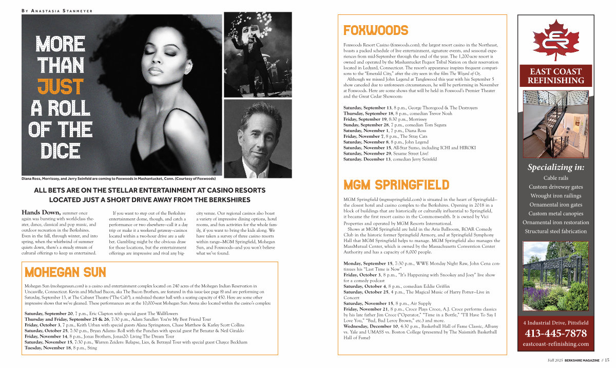 If you want to step out of the Berkshire entertainment dome, though, and catch a performance or two elsewhere— call it a day trip or make it a weekend getaway— casinos located within a two-hour drive are a safe bet. Gambling might be the obvious draw for those locations, but the entertainment offerings are impressive and rival any bigcity venue. Our regional casinos also boast a variety of impressive dining options, hotel rooms, and fun activities for the whole family, if you want to bring the kids along. We have taken a survey of three casino resorts within range— MGM Springfield, Mohegan Sun, and Foxwoods— and you won’ t believe what we’ ve found.