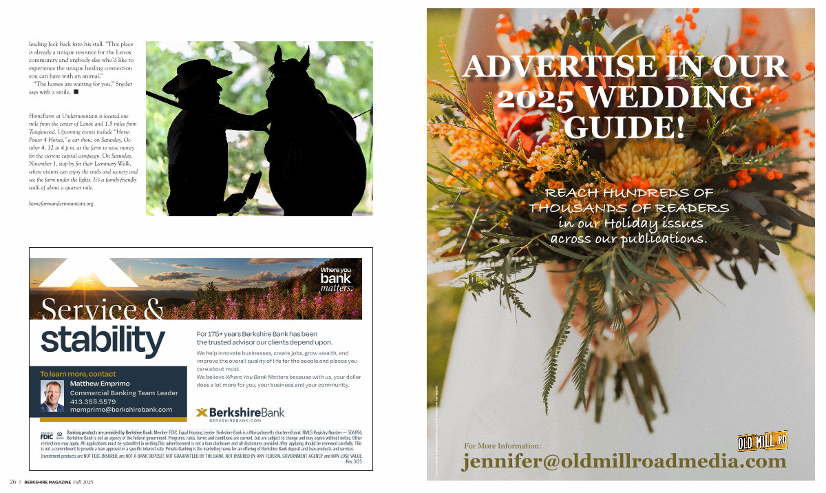 leading Jack back into his stall.“ This place is already a unique resource for the Lenox community and anybody else who’ d like to experience the unique healing connection you can have with an animal.”“ The horses are waiting for you,” Snyder says with a smile. n