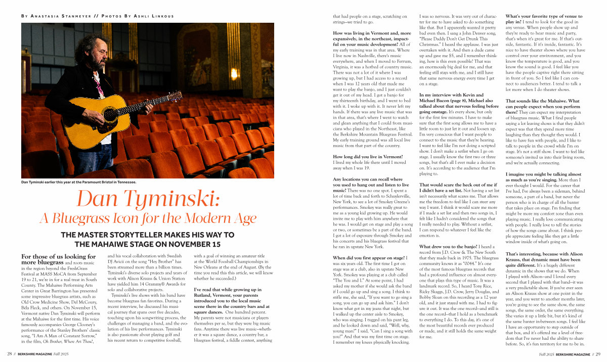 For those of us looking for more bluegrass and roots music in the region beyond the FreshGrass Festival at MASS MoCA from September 19 to 21, we’ re in for a real treat in South County. The Mahaiwe Performing Arts Center in Great Barrington has presented some impressive bluegrass artists, such as Old Crow Medicine Show, Del McCoury, Béla Fleck, and others. On November 15, Vermont native Dan Tyminski will perform at the Mahaiwe for the first time. His voice famously accompanies George Clooney’ s performance of the Stanley Brothers’ classic song,“ I Am A Man of Constant Sorrow,” in the film, Oh Brother, Where Art Thou?, and his vocal collaboration with Swedish DJ Avicii on the song“ Hey Brother” has been streamed more than a billion times. Tyminski’ s diverse solo projects and years of work with Alison Krauss & Union Station have yielded him 14 Grammy ® Awards for solo and collaborative projects.