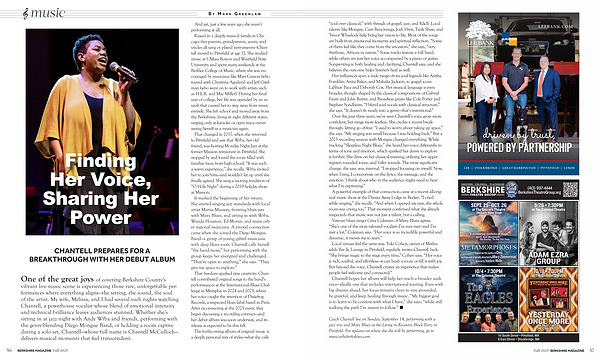 A powerful example of that connection came at a recent all-original music show at the Dream Away Lodge in Becket.“ I cried while singing,” she recalls.“ And when I opened my eyes, the whole room was crying too.” That moment confirmed what she already suspected— that music was not just a talent, but a calling. Veteran blues singer Gina Coleman of Misty Blues agrees.“ She’ s one of the most talented vocalists I’ ve ever met— and I’ ve met a lot,” Coleman says.“ Her voice is so incredibly powerful and dynamic, it moves me to tears.” Local venues feel the same way. Yuki Cohen, owner of Methuselah Bar & Lounge in Pittsfield, regularly invites Chantell back.“ She brings magic to the stage every time,” Cohen says.“ Her voice is rich, soulful, and effortless— it can hush a room or fill it with joy. But beyond the voice, Chantell creates an experience that makes people feel welcome and connected.” Chantell hopes her album will help her reach a broader audience— ideally one that includes international touring. Even with big dreams ahead, her focus remains clear: to stay grounded, be grateful, and keep healing through music.“ My biggest goal is to learn to be content with what I have,” she says,“ while still walking the path I’ m meant to follow.” n