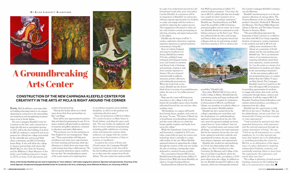 Soon, MCLA will have a new state-of-theart building welcoming visitors to its campus, deepening its connection to the surrounding arts institutions and strengthening its presentation of art in North Adams. The new Campagna Kleefeld Center for Creativity in the Arts, with construction to begin this fall and an anticipated opening in 2027, will be the first building of its kind for MCLA, making it a natural fit and an expansion for a liberal arts college surrounded by the culturally rich, arts-focused Berkshires community, says MCLA President James Birge. It also will allow the college to deepen partnerships with places like MASS MoCA, the Clark Art Institute, and the Williams College Museum of Art( with a new building projected to reopen in 2027), in terms of job placements and reciprocal programming.“ Having this facility allows us to think anew about what those partnerships are like,” says Birge.