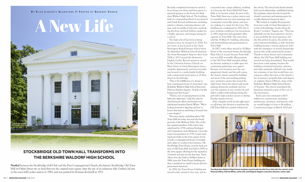 “ We looked at roughly 40 properties from just south of Great Barrington to north of Stockbridge, mostly along the Route 7 corridor,” Sagarin says.“ This was definitely not the least expensive. In fact, it was probably the most expensive, but also the perfect location, the perfect size, and a historical building, as well. And this building became a serious option in 2022 with the emergence of several deep-pocket donors who really anchored the project.” Thanks to those donors and community efforts, the Old Town Hall building was saved from being demolished. That would have been costly anyway, because the building contained lead paint, asbestos, and other materials collected over nearly two centuries of use that would have cost someone – either the town or the church – a lot of money to properly abate and dispose of, explains Teresa O ' Brient, chair of the Berkshire Waldorf High School Board of Trustees. The school remediated the hazardous material as part of the cost of the renovations.