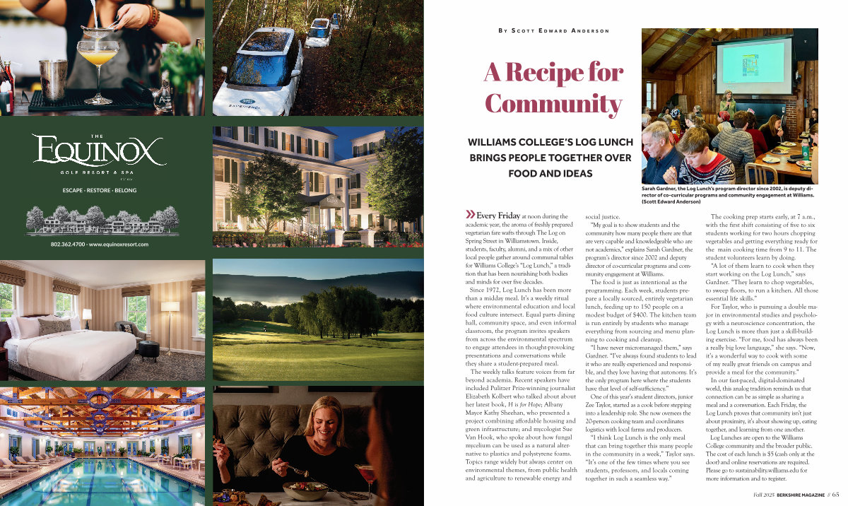 ›› Every Friday at noon during the academic year, the aroma of freshly prepared vegetarian fare wafts through The Log on Spring Street in Williamstown. Inside, students, faculty, alumni, and a mix of other local people gather around communal tables for Williams College’ s“ Log Lunch,” a tradition that has been nourishing both bodies and minds for over five decades. Since 1972, Log Lunch has been more than a midday meal. It’ s a weekly ritual where environmental education and local food culture intersect. Equal parts dining hall, community space, and even informal classroom, the program invites speakers from across the environmental spectrum to engage attendees in thought-provoking presentations and conversations while they share a student-prepared meal.