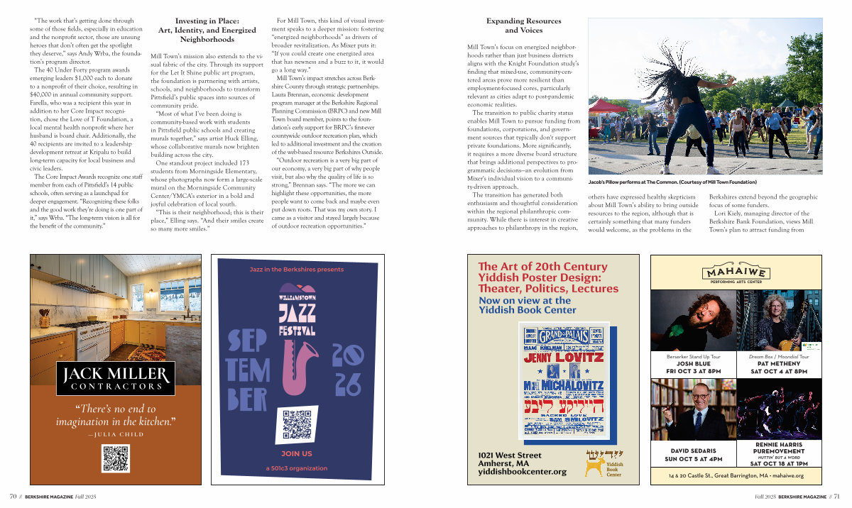 Mill Town’ s mission also extends to the visual fabric of the city. Through its support for the Let It Shine public art program, the foundation is partnering with artists, schools, and neighborhoods to transform Pittsfield’ s public spaces into sources of community pride.