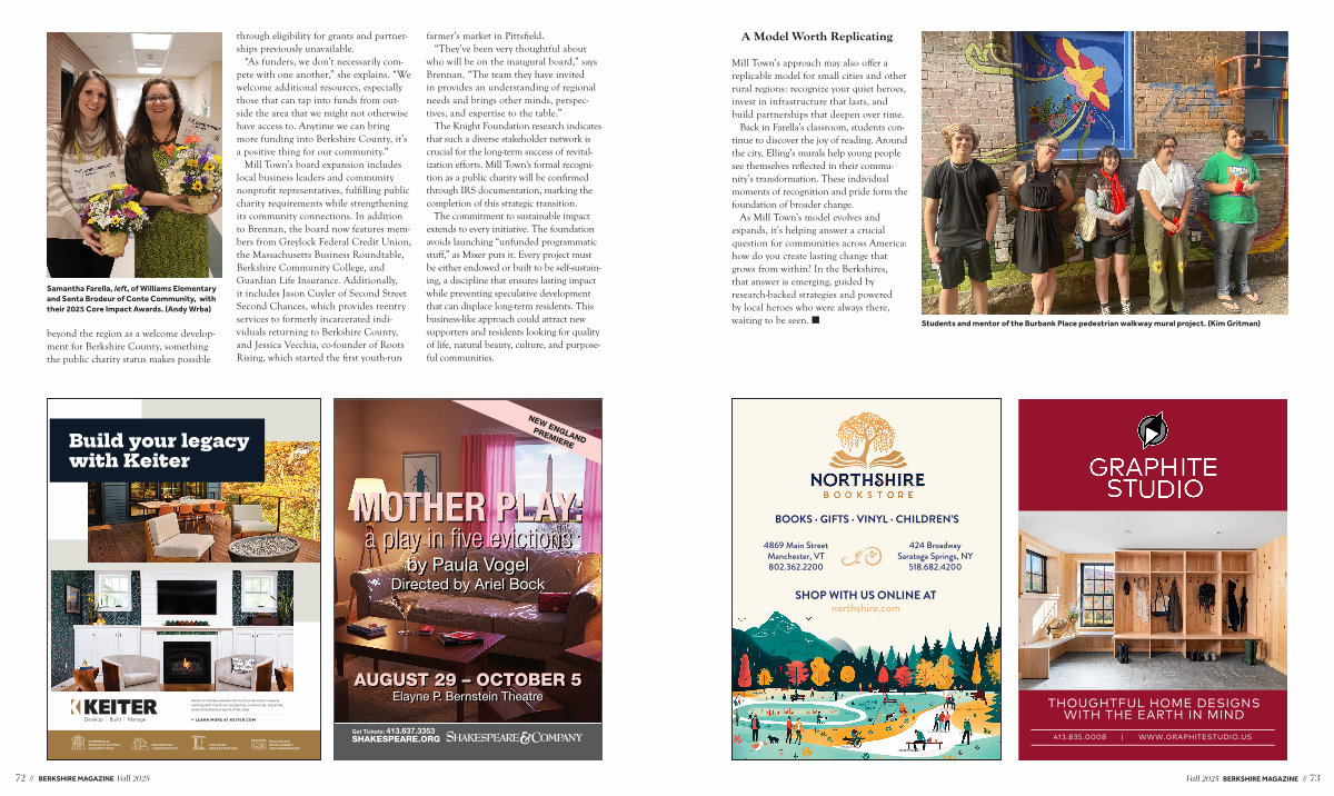 Mill Town’ s board expansion includes local business leaders and community nonprofit representatives, fulfilling public charity requirements while strengthening its community connections. In addition to Brennan, the board now features members from Greylock Federal Credit Union, the Massachusetts Business Roundtable, Berkshire Community College, and Guardian Life Insurance. Additionally, it includes Jason Cuyler of Second Street Second Chances, which provides reentry services to formerly incarcerated individuals returning to Berkshire County, and Jessica Vecchia, co-founder of Roots Rising, which started the first youth-run