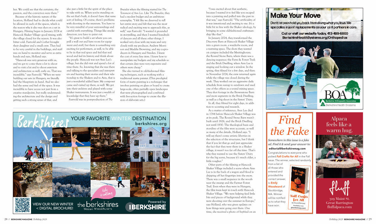 her. We could see that the certainty, the passion, and the conviction were there.” Because of the historic nature of the location, Holland had to decide what could be allowed in each of the spaces, which is the reason why it also was shot on a set in Hungary. Filming began in January 2024 at Hancock Shaker Village— good timing, with the village closed for the season. It was also bitter cold. Fastvold and Corbet brought their daughter and a small crew. They had to be very careful in the buildings, and staff was on hand to monitor and serve as extra hands and eyes, Holland says.“ Hancock was very generous with us, and we got to come there a lot to shoot and to visit a lot and to shoot exteriors and architecture as well, early on. That was incredible,” says Fastvold.“ When we were building our sets in Hungary, we literally had the blueprints in hand. And we also had the sense and feel of the space. It was incredible to have access not just from a creative standpoint, but really understanding the architecture and the design and getting such a strong sense of that, and