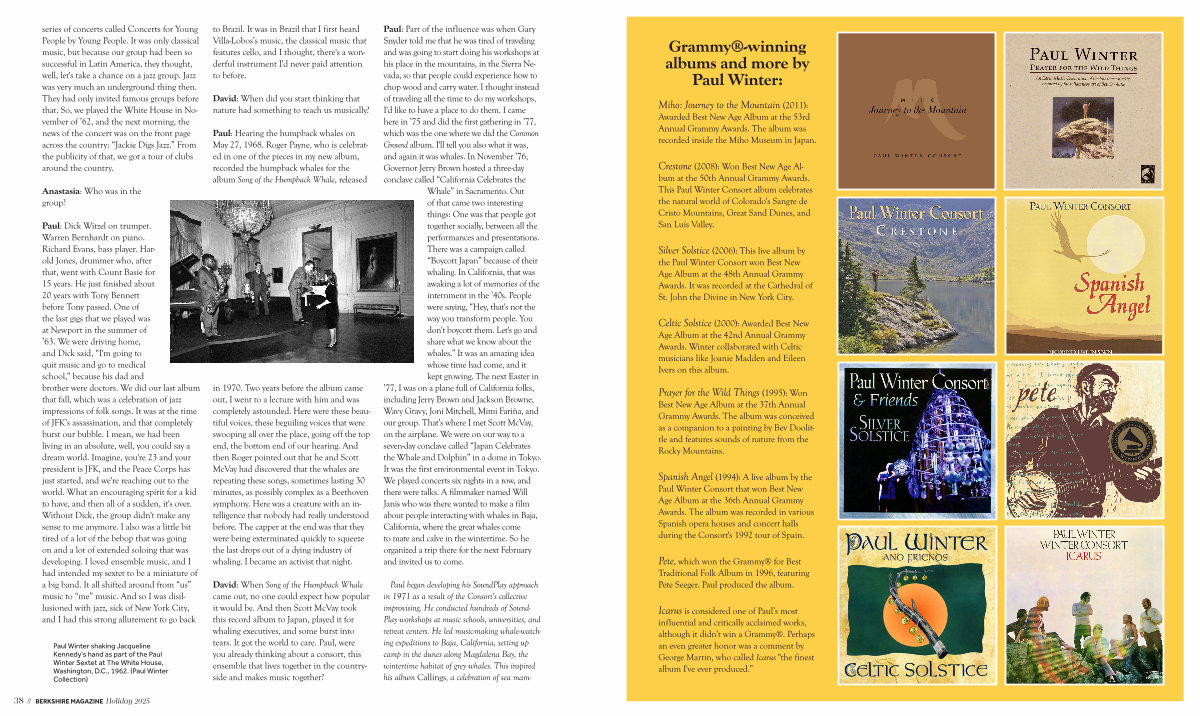 Paul began developing his SoundPlay approach in 1971 as a result of the Consort’ s collective improvising. He conducted hundreds of Sound- Play workshops at music schools, universities, and retreat centers. He led music-making whale-watching expeditions to Baja, California, setting up camp in the dunes along Magdalena Bay, the wintertime habitat of grey whales. This inspired his album Callings, a celebration of sea mam-