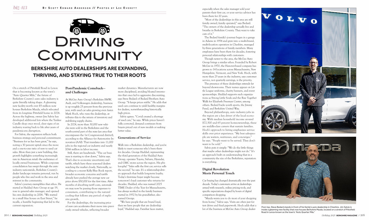 especially when the sales manager sold your parents their first car, or your service advisor has been there for 20 years.“ Most of the dealerships in this area are still family owned, family operated,” says Bedard.“ The owners of the dealership actually live and breathe in Berkshire County. They want to take care of it.” The Bedard family’ s journey began in a garage in Adams in 1954 and grew into a multi-brand, multi-location operation in Cheshire, managed by three generations of family members. Many employees have been there for decades, fostering personal relationships with customers. Though newer to the area, the McGee Auto Group brings a similar ethos. Founded by Robert McGee in 1970, the Hanover-based company has grown to 14 locations across Massachusetts, New Hampshire, Vermont, and New York. Hoch, with more than 25 years in the industry, says customer service, not quarterly earnings, is the priority.
