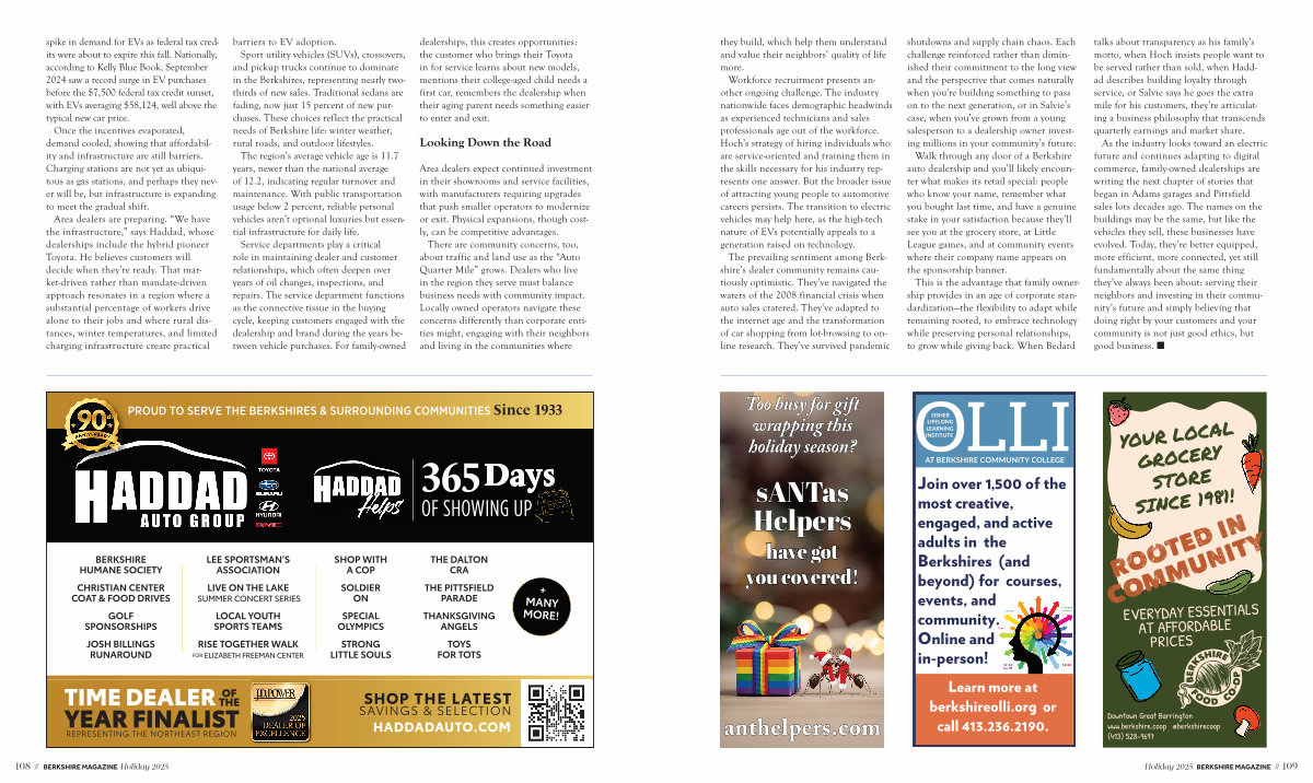 As the industry looks toward an electric future and continues adapting to digital commerce, family-owned dealerships are writing the next chapter of stories that began in Adams garages and Pittsfield sales lots decades ago. The names on the buildings may be the same, but like the vehicles they sell, these businesses have evolved. Today, they’ re better equipped, more efficient, more connected, yet still fundamentally about the same thing they’ ve always been about: serving their neighbors and investing in their community’ s future and simply believing that doing right by your customers and your community is not just good ethics, but good business. n