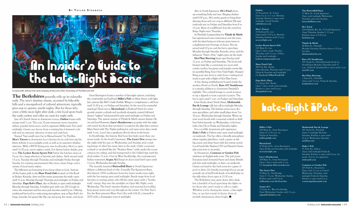 Just off Church Street in downtown Lenox, Ombra buzzes with energy until 1 a. m. The cozy 32-seat restaurant serves inventive dishes, popular birria tacos, and its signature Millionaire Tots until midnight. Guests can choose from a rotating list of featured cocktails and an extensive selection of wine and craft beer. Named“ best small town bar in Massachusetts” by Thrillist, Moe’ s Tavern in downtown Lee is known for its craft beer tap list( their website is nocoorslight. com), as well as its extensive whiskey selection. With a BYOF( bring your own food) policy, Moe’ s is open until 11:30 p. m. seven nights a week. For dinner before drinks, pop in to The Locker Room Sports Pub before the kitchen closes at 9 p. m. for a large selection of favorite pub dishes. Stick around until 11 p. m. Tuesday through Thursday and midnight Friday through Sunday, for rotating entertainment like trivia, music bingo, and a variety of local music talent. The hilltowns are humming if you know where to look. Venture off the beaten path to the Shaw Pond Club located on Otis Road in Becket. Karaoke, darts and live music punctuate the week— open until 11 p. m. Monday through Thursday and midnight on Fridays and Saturdays. Papa Bob’ s Place, also in Becket, is open until midnight Monday through Saturday. A hidden gem with over 200 Google reviews, the restaurant and bar serve pub favorites until 8 p. m. Offering traditional bar food in a welcoming atmosphere, stop at Papa Bob’ s for bingo, karaoke, bar games like flip cup and pong, live music, and more.