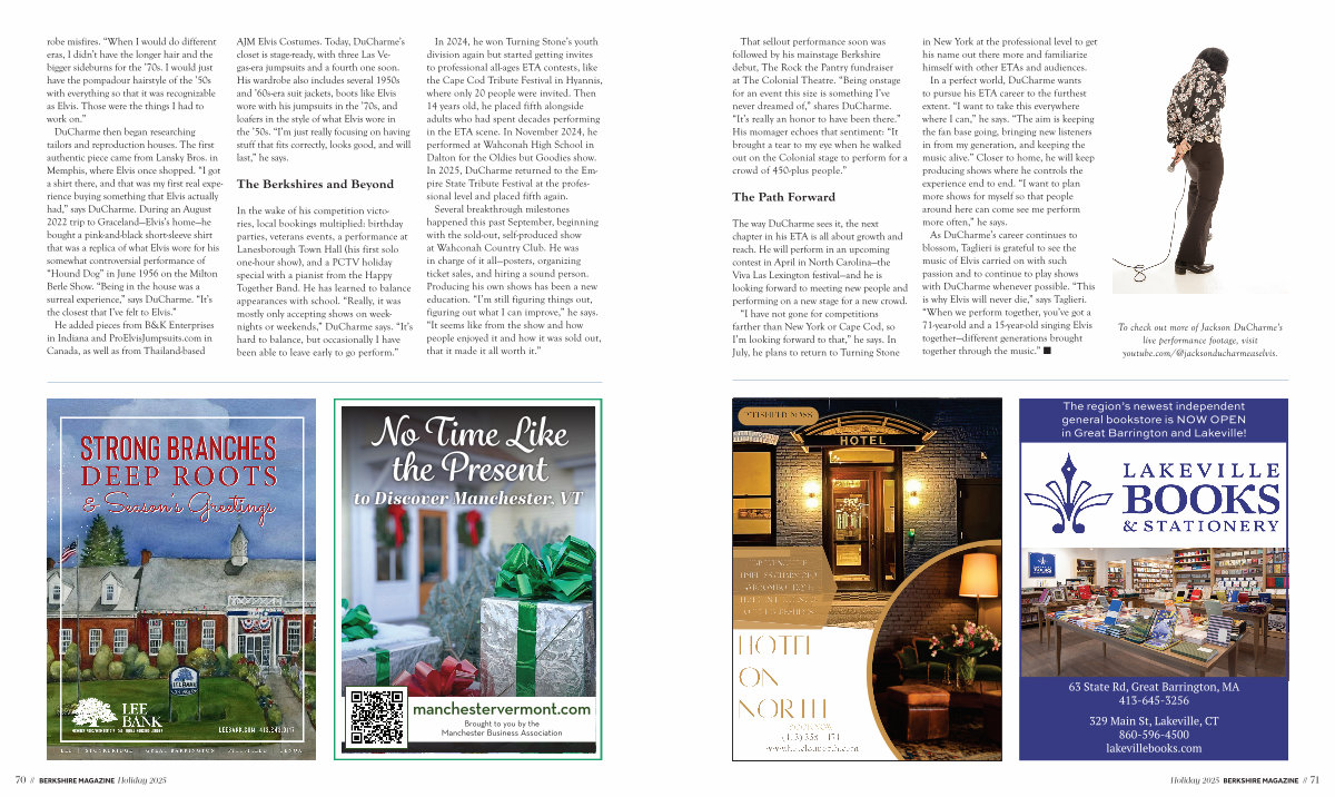 In the wake of his competition victories, local bookings multiplied: birthday parties, veterans events, a performance at Lanesborough Town Hall( his first solo one-hour show), and a PCTV holiday special with a pianist from the Happy Together Band. He has learned to balance appearances with school.“ Really, it was mostly only accepting shows on weeknights or weekends,” DuCharme says.“ It’ s hard to balance, but occasionally I have been able to leave early to go perform.”