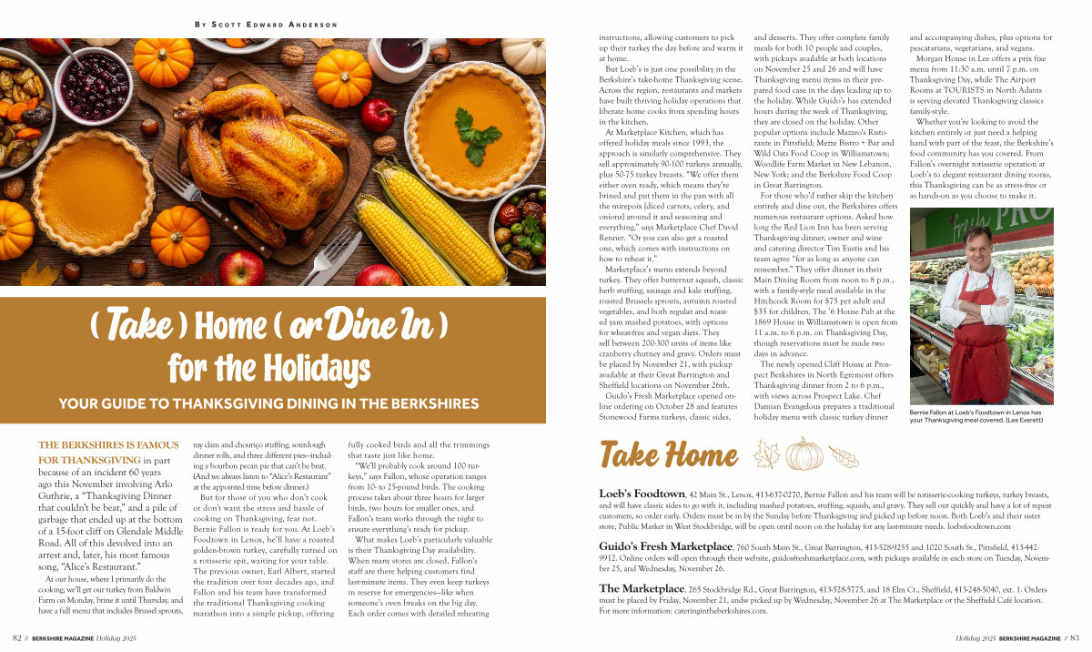 Whether you’ re looking to avoid the kitchen entirely or just need a helping hand with part of the feast, the Berkshire’ s food community has you covered. From Fallon’ s overnight rotisserie operation at Loeb’ s to elegant restaurant dining rooms, this Thanksgiving can be as stress-free or as hands-on as you choose to make it.