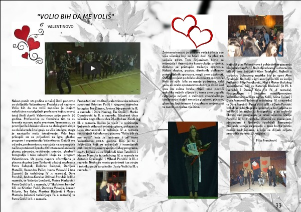 Najbolji glas Valentinova i pobjednik u pjevanju bio je Kristian Polić. Najbolji udvarač i udvaračica bili su Ines Sabljak i Alen Tatalović. Najbrži u ispijanju ljubavnog napitka bio je opet Alen Tatalović. Najbolji u igri asocijacija bili su Lucija Puškarić i Filip Franjković.. Miss i Mister školskog Valentinova bili su Katarina Blažević (iz IV. b razreda) i Daniel Orle (iz IV. d razreda). Fotografijom i likovnim osmišljavanjem Valentinova bavili su se Iva Kolić, Ivana Sušanj i Dora Francetić (učenici tadašnjeg IV. c razreda) te Dora Porubić i Petra Višić iz III. c i Daria Porubić iz II. d razreda. Nagrade i priznanja dodijeljena su Ivi Kolić za najbolju fotografiju, a za najbolji likovni rad proglašen je crtež učenice Darije Porubić iz II. d razreda. Učenici su plesanjem, pjevanjem i ljubavlju podržali kampanju Milijarda ustaje za pravdu u znak borbe protiv nasilja nad ženama, a koja se diljem svijeta provodila upravo 13. veljače.