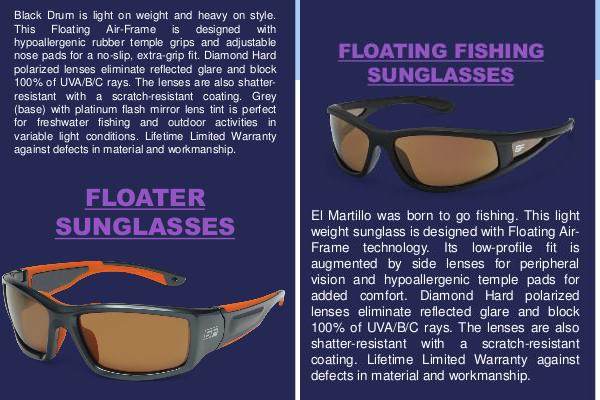 El Martillo was born to go fishing. This light weight sunglass is designed with Floating Air- Frame technology. Its low-profile fit is augmented by side lenses for peripheral vision and hypoallergenic temple pads for added comfort. Diamond Hard polarized lenses eliminate reflected glare and block 100 % of UVA / B / C rays. The lenses are also shatter-resistant with a scratch-resistant coating. Lifetime Limited Warranty against defects in material and workmanship.