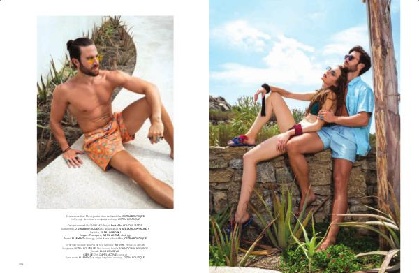 In the right opposite page: MARIANKA: Swimsuit, Pretty Me, HONDOS CENTER Sunglasses, OSTRIA BOUTIQUE, Necklace and bangles, VALTADOROS MYKONOS Sandals, ELINA LINARDAKI GEORGE: Shirt, CAMEL ACTIVE, clodist. gr Swim trunks, BLUEMINT, clodist. gr, Sunglasses and rings, OSTRIA BOUTIQUE