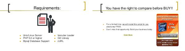 Requirements: Unix/Linux Server PHP 5.0 or higher Mysql Database Support Ioncube Loader GD Library cURL
