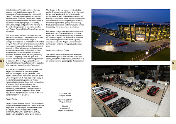 raise the stakes." Horacio believes that, by pushing experts to improve upon the production of bespoke cars, the experts will create “timeless masterpieces that transcend mere fads and fashions.” This is why Pagani automobiles are considered bespoke: “there is no automation but people you can call by name, knowledge, and passion for working in the highest expression of our work, car after car.” Pagani Automobili is, effectively, an artisan workshop.