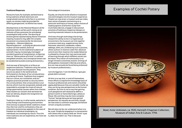 Museums have, for example, worked hard to bring traditions of both dominant and marginalized cultures to the fore in a common space, so context might be provided for differing perspectives. As Mithlo has noted,