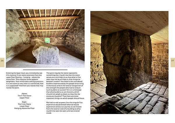 Entering the lower level, you immediately see this massive 11-ton stone extension from the upper floor floating – hanging – above the stone floor. This massive stone appears weightless. Your mind starts asking questions: is it one stone or two, how is it connected, how is it supported? And then you realize that may not be the point.
