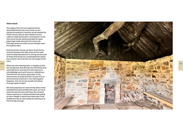 Entering Hither House, we were struck by the contrast between the light stone of the walls and the deep blackness of a ceiling constructed of wood charred by fire, suspended from which was another tree limb that ran the length of the room.