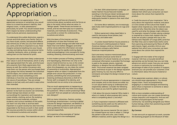 5. Engage with the maker of the original material: Ask how a mutually beneficial partnership can be formed, how you can help advance an artist's career, how you can assist a culture or institution by contributing a percentage of sales of your product in support, and how you can provide your customer a link to information about the source material or culture.