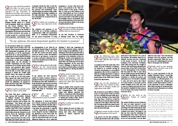60 BEST SPEAKER MAGAZINE 2017 an undergraduate or not. Even for an unemployed human being, it’ s something extremely necessary. At the same time, the club also teaches and trains people on how to work as a team. The members learn how to get along as a team, how to accept constructive criticism, how to correct your mistakes and overall, how to develop yourselves.