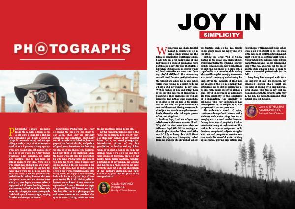 My far wandering mind comes to the‘ now’. I’ m standing in front of a 70-yearold Mahogany cabinet at my ancestral home. On it, are several photographs. Monochrome pictures of my late grandfather in London and my father when he was just a toddler, one with my siblings when I was only ten and they were seven and five years, photos of my family, taken during vacations, wedding photographs of my parents, my cousins and their babies. And of course, my most favourite ones out of all, the photograph of my mother’ s graduation and right behind it, 23 years later, the photo of my own graduation.