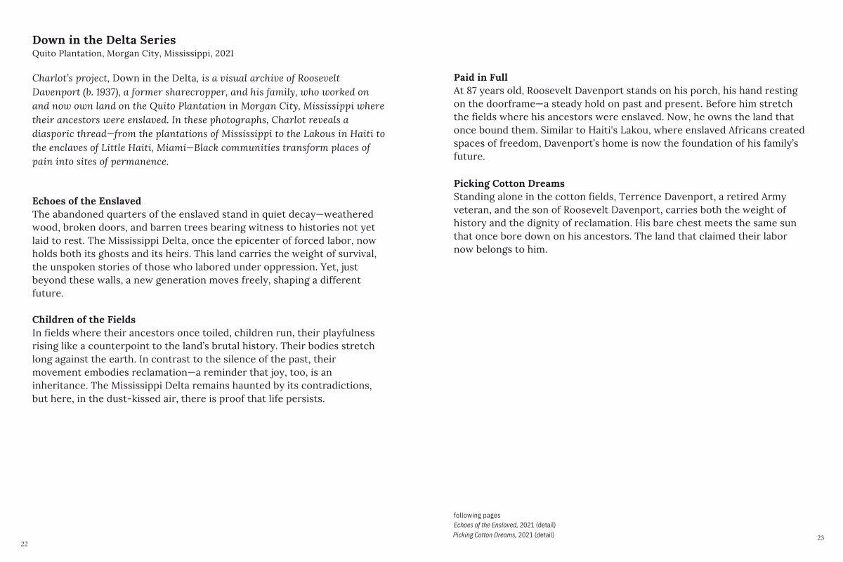 Paid in Full At 87 years old, Roosevelt Davenport stands on his porch, his hand resting on the doorframe— a steady hold on past and present. Before him stretch the fields where his ancestors were enslaved. Now, he owns the land that once bound them. Similar to Haiti ' s Lakou, where enslaved Africans created spaces of freedom, Davenport’ s home is now the foundation of his family’ s future.
