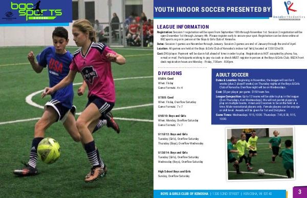 Location: All games are held at the Boys & Girls Club of Kenosha’s indoor turf field, located at 1330 52nd St.