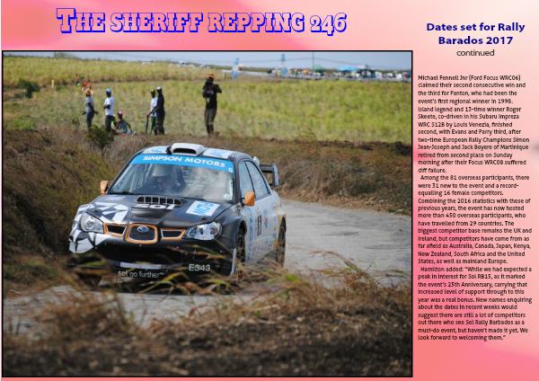 Island legend and 13-time winner Roger Skeete, co-driven in his Subaru Impreza WRC S12B by Louis Venezia, finished second, with Evans and Parry third, after two-time European Rally Champions Simon Jean-Joseph and Jack Boyere of Martinique retired from second place on Sunday morning after their Focus WRC08 suffered diff failure.
