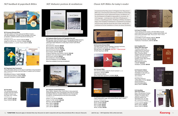 NLT Economy Outreach Bible The adult editions of these value-priced Bibles include a 365-day reading plan , an index of key passages , and a plan of salvation . Children ’ s edition features at koorong . com .
