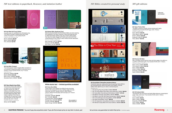 NIV Slimline Bible ( Anglicised Text ) Bible Society Australia ’ s new NIV Slimline Bibles are hard-wearing and designed to be taken anywhere . Featuring Anglicised text to reflect Australian spelling , they also contain useful guides that help the reader engage with God ’ s word and enrich their understanding of the context in which biblical stories take place . Premium Imitation Leather NI TX Blue Lavender | 641791 $ 39.99 Charcoal | 641790 $ 39.99 Rich Green | 641789 $ 39.99