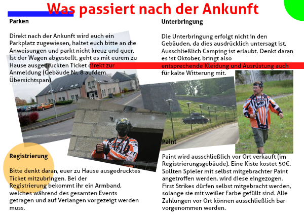 Paint wird ausschließlich vor Ort verkauft (im Registrierungsgebäude). Eine Kiste kostet 50€. Sollten Spieler mit selbst mitgebrachter Paint angetroffen werden, wird diese eingezogen. First Strikes dürfen selbst mitgebracht werden, solange sie mit weißer Farbe gefüllt sind. Alle Zahlungen vor Ort können ausschließlich bar
