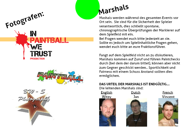 Mashals werden während des gesamten Events vor Ort sein. Sie sind für die Sicherheit der Spieler verantwortlich, dies schließt spontane, chronographische Überprüfungen der Markierer auf dem Spielfeld mit ein.
