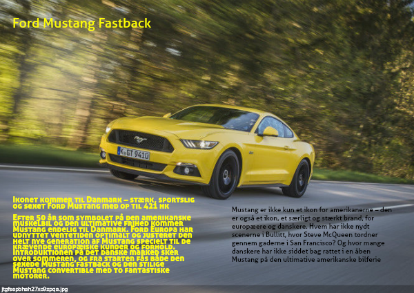 Efter 50 år som symbolet på den amerikanske muskelbil og den ultimative frihed kommer Mustang endelig til Danmark. Ford Europa har udnyttet ventetiden optimalt og justeret den helt nye generation af Mustang specielt til de krævende europæiske kunder og forhold. Introduktionen på det danske marked sker over sommeren, og fra starten fås både den sexede Mustang fastback og den stilige Mustang convertible med to fantastiske motorer.