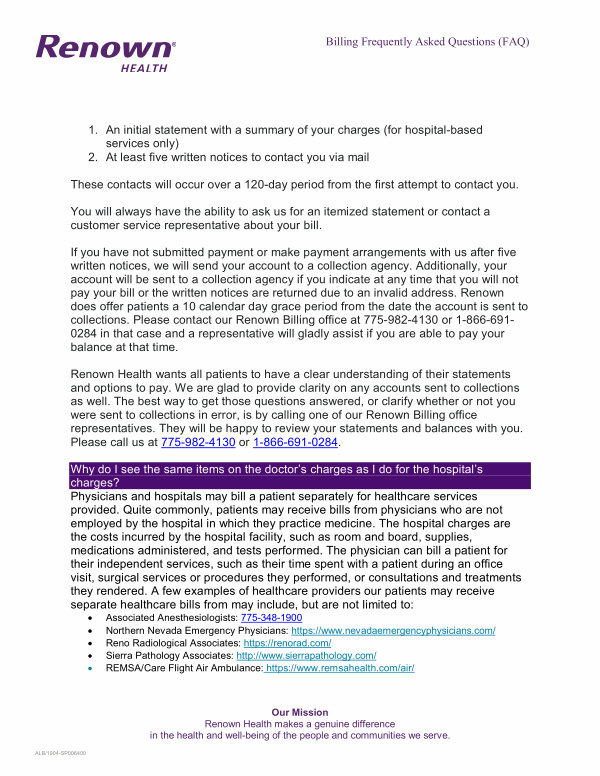 Renown Health wants all patients to have a clear understanding of their statements and options to pay. We are glad to provide clarity on any accounts sent to collections as well. The best way to get those questions answered, or clarify whether or not you were sent to collections in error, is by calling one of our Renown Billing office representatives. They will be happy to review your statements and balances with you. Please call us at 775-982-4130 or 1-866-691-0284.