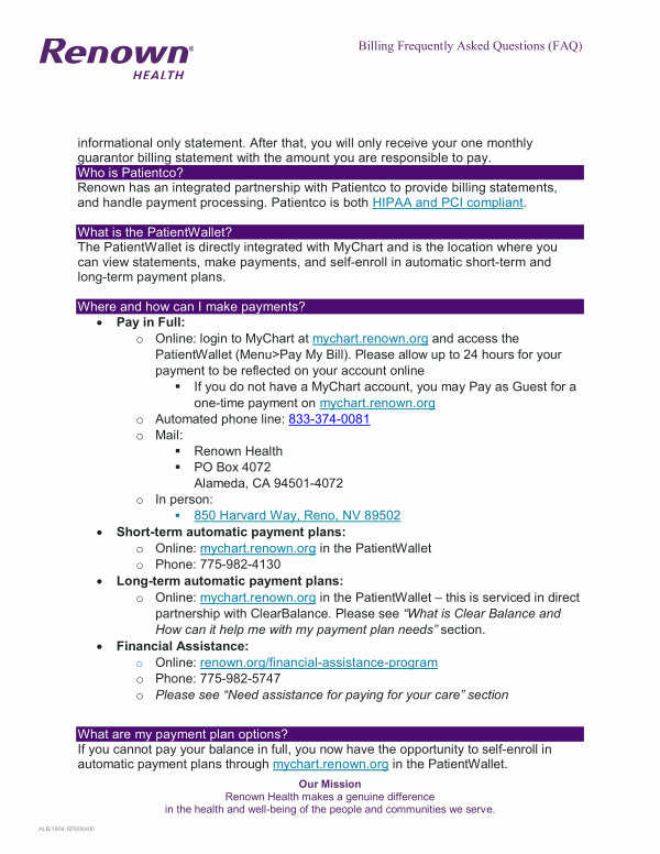 • Short-term automatic payment plans: o Online: mychart. renown. org in the PatientWallet o Phone: 775-982-4130
