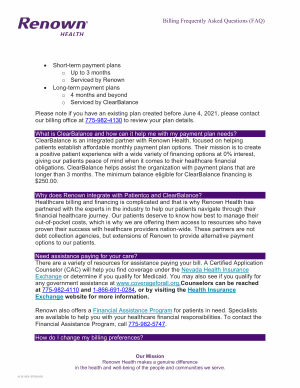 Why does Renown integrate with Patientco and ClearBalance? Healthcare billing and financing is complicated and that is why Renown Health has partnered with the experts in the industry to help our patients navigate through their financial healthcare journey. Our patients deserve to know how best to manage their out-of-pocket costs, which is why we are offering them access to resources who have proven their success with healthcare providers nation-wide. These partners are not debt collection agencies, but extensions of Renown to provide alternative payment options to our patients.